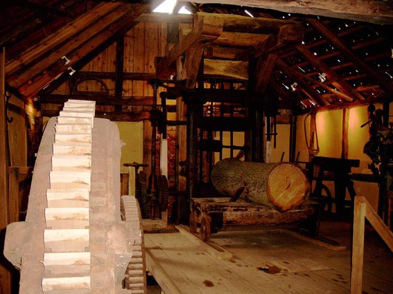 Das fertig eingerichtete “Museum Bussauer Sägemühle”. Vorn Kammrad und Vorgelege, im Hintergrund das in einem Balkenrahmenständer montierte Vertikalgatter. Dieses kann nur ohne Last mit einem Elektromotor zu Schauzwecken betrieben werden. |
