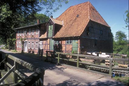 Wassermühle Ellringen Um 1300 wurde die Ellringer Mühle etwas außerhalb des Ortes an der Neetze angelegt. Lange im Besitz des Klosters und später des Amtes Lüne, erlebte sie im Dreißigjährigen Krieg mehrfache Plünderungen. Dennoch erwirtschafteten ihre Müller in der Folgezeit ein solches Vermögen, daß die Korn- und Ölmühle problemlos wieder aufgebaut werden konnte, nachdem durchziehende Truppen sie 1813 nach der Göhrdeschlacht schwer beschädigt hatten. 1860 kam es jedoch zur Zwangsversteigerung und in den folgenden hundert Jahren wird die Mühle nun mehrfach verkauft und verpachtet. Seit Ende des 19. Jhs. um einen Futtermittelhandel erweitert, erhielt sie 1927 Turbinenantrieb und seit den vierziger Jahren Elektromotoren, die sie weitgehend von der Wasserkraft unabhängig machten. Der Verkauf des Hofgrundstückes 1960 führte schließlich zur Stillegung: Der letzte Mühlenpächter mußte die Mühle räumen und in der Folgezeit verlor sie ihre gesamte Einrichtung. Das Mühlengebäude aus dem Jahr 1819 mit dem nach einem Brand 1902 neu errichteten Wohntrakt ist aber noch bis heute ein eindrucksvoller Zeuge dieses alten Mühlenstandortes. |