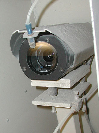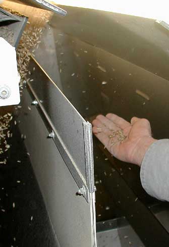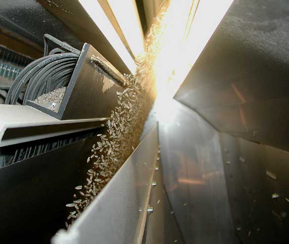Das Trennsystem der Anlage mit Ausblasdüsen und Auffangbehältern - der Kornschleier passiert die im oberen Bildteil erkennbare Batterie der mit Druckschläuchen bestückten Ausblasdüsen. Die Düsenbatterie befindet sich ca. 35 cm unterhalb der Lichtschleuse, das bedeutet, dass die Berechnung der Positionsdaten des von der CCD Kamera erfassten “schlechten Korns” und ein entsprechender Steuerbefehl an die richtige Ausblasdüse innerhalb eines Zeitraumes erfolgen muß, der der Dauer des Fallweges von ca. 35 cm entspricht. Dieser Vorgang spielt sich mit hoher Genauigkeit und Treffsicherheit innerhalb von Millisekunden ab.