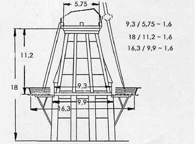 Querschnitt durch die Korn- und Grützmühle Zeldenrust / Groningen. Höhen- und Durchmesserverhältnisse gehorchen den Regeln des Goldenen Schnittes.
