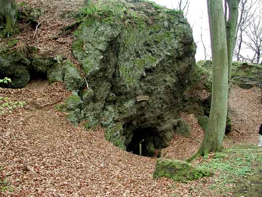 Während in der Mayen - Kottenheimer Region der vulkanischen Osteifel Mühlsteine seit der Antike vorwiegend aus Basaltlava gebrochen wurden, begann im hohem Mittelalter in der westlichen Vulkaneifel im Gebiet um Daun - Gerolstein der Abbau von vulkanischer Schweißschlacke für die Mühlsteinherstellung. Steine aus diesem Material fanden überwiegend in Lohmühlen Verwendung, da sie “... die Lohe flockiger mahlen, als irgend eine andere Steinart.” Noch im 19. Jahrhundert wurden Mühl- und Kollergangsteine aus Schweißschlacke in die Lohmühlen des Elsaß und Belgiens geliefert. Schweißschlacke ist ein zusammengebackenes Auswurfmaterial, das in Vulkannähe abgelagert wurde und große homogene Gesteinsmassen bildet (in obigen Bild deutlich erkennbar), die nur wenig durch Klüfte und Spalten gestört sind. - In der geologischen Literatur und in Landschaftsbeschreibungen der Eifel wird der Mühlenberg bei Hohenfels als das bekannteste Abbaugebiet für Mühlsteine aus Schweißschlacke und daneben auch aus Basaltlava in der westlichen Vulkaneifel dargestellt. Dabei ist von besonderer Bedeutung, dass die Gewinnung zum großen Teil in unterirdischer Bauweise erfolgte. Höhlen und Stollen folgten den relativ wenigen Schichten fest verbackener Schweißschlacke des Mühlenbergvulkans.