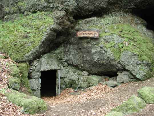 Schwedenfeste wird diese Mühlsteinhöhle in der Schweißschlacke des Mühlenberges genannt. Sie soll im 30 jährigem Krieg als befestigter Unterschlupf gedient haben. Die Höhle ist etwa 21,00 m tief und max. ca. 9,00 m breit. An den Wandungen des Höhleninnern sind deutlich die Arbeitsspuren der Steinhauertätigkeiten zu erkennen.