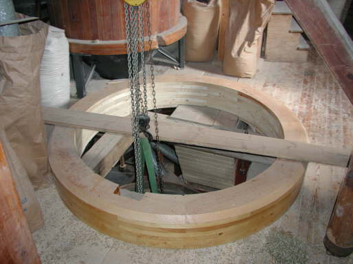 Mit dem neu angefertigten hölzernen Steinkranz, der den festliegenden Bodenstein aufnimmt, wird die Position des Mahlganges endgültig festgelegt. Vorn ist eine Aussparung an der Innenkante des Steinkranzes zu erkennen, durch die das Mahlgut zur weiteren Verarbeitung und Verfüllung abgeführt wird.