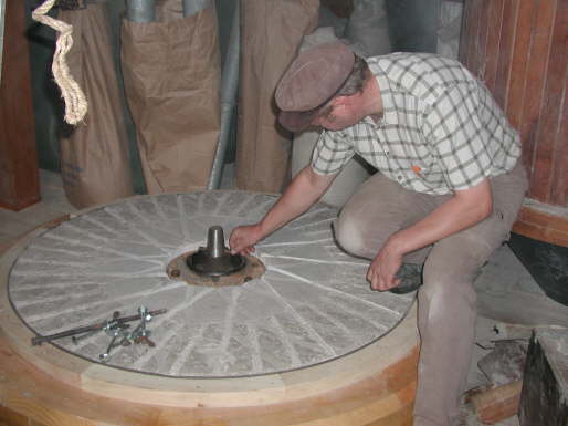 Der fertig eingebaute Bodenstein in der Steinzarge. Die Mitnehmerzapfen am konisch geformten Kopf des Mühleisens bilden mit dem Treiber der Balancier- haube eine starre Verbindung zur Übertragung der Drehbewegung auf den Läufer.