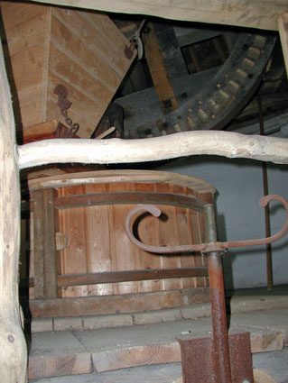 Eine steinerne Wendeltreppe an der Außenwand des Turmes führt zum Kappenboden. Unterhalb des Bodens erkennt man das Lichtwerk des Steinmahlganges.