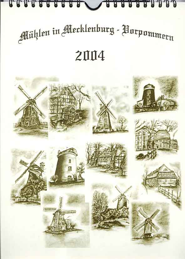 herausgebracht. Die Kalenderblätter im DIN A4- Format zeigen Kohlezeichnungen der Künstlerin Martina Kriedel aus Zapel und sind auf der Rückseite mit informativen Texten von Jürgen Kniesz aus Waren, Vorsitzender des Mühlenverein Mecklenburg-Vorpommern e.V., versehen. Vier Wassermühlen und acht Windmühlen werden dargestellt, darunter die Bruchmühle Brahlstorf ( Nr.6 der Niedersächsischen Mühlenstrasse), die fünf Woldegker Windmühlen und die Schweriner Schleifmühle. Der sehr ansprechend gestaltete Kalender kostet 12,90 EUR und kann bezogen werden bei: