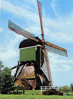 Kokerwindmühle als Poldermühle mit offenem Schöpfrad in Schelluinen. Flügeldurchmesser 25,30 m. Bei Änderung der Windrichtung muss das Flügelkreuz mit dem oberen Gehäuseteil nachgeführt werden.