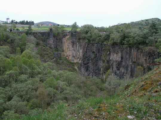An der Landstrasse L 82 zwischen Ettringen und Mayen in der Osteifel liegt im Basaltlavastrom des Bellerberg-Vulkans die “Historische Lay” (Lay = Steinbruch), ein stillgelegtes großräumiges Basalt- und Tuffstein-Grubenfeld, das vor allem durch bis zu 40 m hohe Basaltsäulen beeindruckt. Obgleich am Westhang der Ettringer Lay in Schutthalden römische Mühlsteine und Rohlinge gefunden wurden, die auf die Existenz antiker Steinbruchtätigkeit in der Ettringer Lay hindeuten, hat die Mühlsteinherstellung hier im Vergleich zu den Mayener Grubenfeldern keine besondere Rolle gespielt. Erst Mitte des 19. Jahrhundert begann mit der Mechanisierung der Abbautechnik die industrielle Ausbeutung des Basaltvorkommens und erlebte Anfang des 20. Jahrhunderts mit 600 bis 700 Beschäftigten eine beachtliche wirtschaftliche Blüte. - Gleich von drei vulkanischen Schlackenkegeln ist die 3000 Einwohner zählende Ortschaft Ettringen umgeben, der 590 m hohe Kegel des Hochsimmer gilt als Ettringens “Hausberg”, am Hochstein (563 m - im Bild links) findet man die sagenhafte “Genovevahöhle” und der bekannte Bellerberg (428 m - im Bild rechts), in dessen Lavastrom auch das Mayener Grubenfeld liegt, gilt bei Wissenschaftlern als eine der interessantesten vulkanischen Regionen Europas. Die zu großen Teilen renaturierte Historische Lay wurde in jüngster Zeit touristisch erschlossen. Ein Rundwanderweg führt zu markanten Standorten der Steinbruchtechnik und naturkundlichen Highlights der vulkanischen Landschaft, die auf detailreichen Informationstafeln entlang des Rundweges in Text und Bild erläutert wird. Mühlenfreunde sind eigentlich immer auch Technikfans und wer darüberhinaus noch ein weitergehendes Interesse hegt für die höchst interessanten Spuren einer dramatischen erdgeschichtlichen Vergangenheit in einer der bedeutendsten vulkanischen Regionen Europas, dem sei ein Besuch der “Historischen Lay” in Ettringen unbedingt empfohlen.