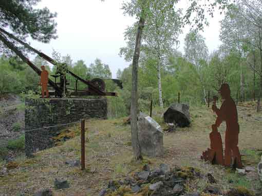 Standort am Rundwanderweg in der Historischen Lay. - Lebensgroße, aus zentimeterdicken Stahlplatten geschnittene Skulpturen stellen den Stein- metz (Layer) bei der Arbeit dar. Im Hintergrund ist auf einem gemauerten Sockel ein Elektrokran (Layenkran) montiert, der die ausgebrochenen Blöcke aus dem ca. 3o m tiefen Bruch (Lay) zur weiteren Bearbeitung auf den Steinhauerplatz hebt. |