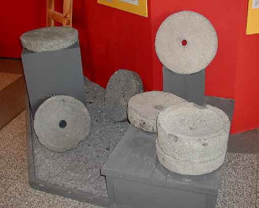 Römerzeitliche Handmühlen aus Mayener Basaltlava (Originale). Der Läuferstein wird “Catillus” und der Bodenstein “Meta” genannt. Die Mahlflächen haben eine flache Kegelform. Zur Handhabung ist in die Seitenfläche des Catillus ein ca. 4 cm weites und ca. 9 cm tiefes Loch eingearbeitet, das einen Holzstock als Drehstock aufnehmen kann. Populär wurden diese Mühlen als römische “Legionärsmühlen“ - einer Kochgemeinschaft von 8 - 10 Soldaten wurde eine dieser Mühlen zur Herstellung des täglichen Mehlbedarfes zugeteilt. Der Durchmesser der Steine liegt bei 40-50 cm und die Höhe bei 10-12 cm.