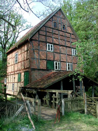 Hohe Laubbäume stehen auf der Mühleninsel, die von Mühlenumflut und Luhe umflossen werden. Vorn, zur Straße hin duckt sich das Backhaus aus dem frühen 19. Jh., hinten, am Rand des kleinen Wäldchens, steht ein Fachwerkgebäude am Wasser: die Soderstorfer Mühle. In der Radstube dreht sich das sechs Meter mächtige Wasserrad, von dem eine Transmissionswelle zur Kreissäge auf der anderen Giebelseite führt. Ein Steg führt von der Mühle hinüber zum Hof mit seinem Haupthaus von 1848, der heute auch einige Ferienwohnungen anzubieten hat. 1427 finden wir diese Mühle erstmals bezeugt, die seit 1650 bis heute im Besitz der Familie Vogt ist. 1821 ist das jetzige Mühlengebäude entstanden, das als Mahl-, Öl-, Grütz-, Loh- und Sägemühle gedient hat. In den 1960er Jahren war die Mühle dann nur noch für den Eigenbedarf tätig und stand dann lange Zeit still. Renovierungsarbeiten setzten das Mühlenrad jedoch wieder instand, so daß die Mühle heute gelegentlich wieder zu Mahl- und Backtagen in Gang gesetzt werden kann. Das jährliche Mühlenfest auf der Mühleninsel zählt zu den schönsten ländlichen Festen in der Lüneburger Region.