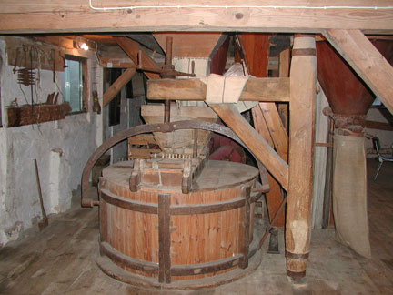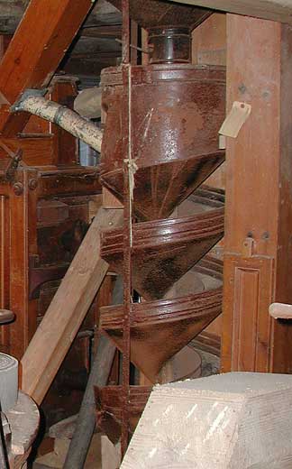 Der Schneckentrieur - auch Spiralausleser genannt - ist die einzige Maschine in der Mühle, die keine Antriebskraft benötigt. Sie trennt beim Herablaufen infolge unterschiedlicher Fliehkräfte die verschiedenen Unkrautsamen wie z.B. Raden und Wicken und auch Bruchgetreide voneinander. |
