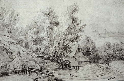 Anthonie Waterloo um 1660 Kleine Wassermühle bei Blankenese Der ehemalige Standort läßt sich nicht mehr bestimmen. Es ist zu vermuten, dass es sich um eine Wassermühle an einem der zur Elbe führenden Erosionstäler bei Blankenese handelt. Auf der Rückseite dieser Zeichnung sind die Blankeneser Berge dargestellt.