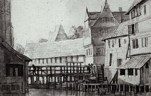 Ein Holzsteg führt über das Alsterfleet, den Abfluss der Kleinen Alster in die Elbe. Früher wurde der Steg “Bey der Mühlen” genannt, heute verläuft dort die Graskellerbrücke. Am Steg befindet sich ein Stauwehr, dessen Schotten durch Öffnen das unterschlächtige Mühlrad der Wassermühle in Bewegung setzen. Gegenüber ist am linken Bildrand der Turm einer Wasserkunst (Pumpanlage für Trinkwasser) zu sehen, dessen Wasserrad für den Antrieb des Schöpfmechanismus sich in dem mit einem Pultdach gedecktem Anbau befindet. Wasserkunst und Wassermühle ist eine häufig anzutreffende technische Kombination an wasserreichen Flussläufen zur Versorgung städtischer Gemeinwesen ( siehe auch Ratsmühlen und Abtsmühle in Lüneburg sowie die Stadtmühlen “Bei der Kunst” am Jungferstieg in Hamburg)