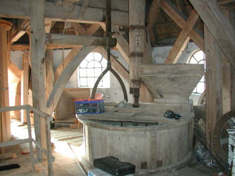 Im oberen Geschoss des Sockelunterbaus in Höhe der Galerie befindet sích der Steinboden mit einem funktionsfähigem Mahlgang.
