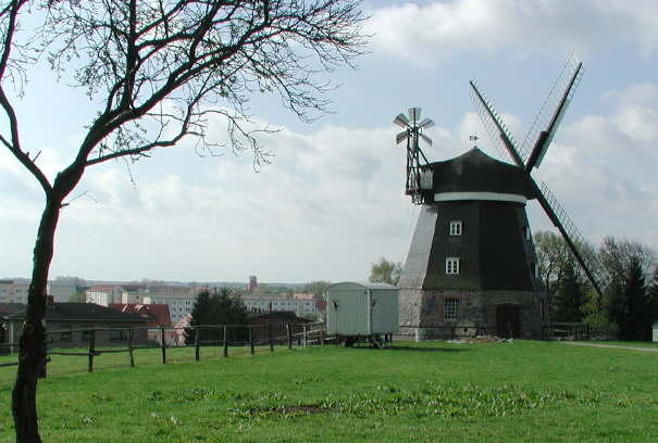 Zwei-Mühlen-Blick auf Otto Budde´s Mühle (Museumsmühle im Vordergrund) und die etwa 1.200 m entfernte flügellose Töpfermühle (Moulin Rouge im Hintergrund).