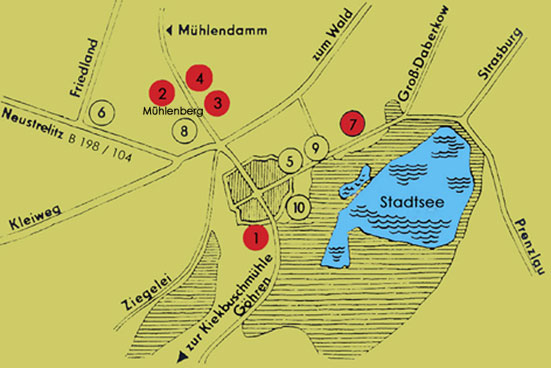 Nach der örtlichen Heimatforschung war die erste Mühle, von der es in Woldegk Kunde gab, eine Wassermühle. Sie wurde aus dem Stadtsee gespeist und soll im 15. Jhdt., vielleicht sogar schon bei der Stadtgründung im 13. Jhdt. erbaut worden sein. Der Stadtsee war allerdings ein sehr unzuverlässiger Energielieferant, so dass die Mühle, nach ihrem Standort “Kiekbuschmühle” genannt, durch den Müller Simon Gerven im Jahre 1587 wegen des unzureichenden Wasserangebotes stillgelegt und dem Verfall preisgegeben wurde. Als Ersatz baute Gerven auf dem Mühlenberg eine Bockwindmühle an jener Stelle, an der heute der flügellose Turmholländer der Familie Ramme steht (s. Lageplan Nr.4). Mit dieser Bockwindmühle beginnt die dokumentierte Geschichte der Woldegker Windmühlen. - In einer rasanten Entwicklung wuchs die Woldegker Mühlenlandschaft in der kurzen Zeit von nur vier Jahrzehnten auf vier Bockwindmühlen an, die im Jahre 1634 als Bestand verzeichnet wurden. Zumindest einige von ihnen haben offenbar auch die schweren Belastungen des Dreißigjährigen Krieges überstanden, nach dessen Ende 1647 in Woldegk nur noch 14 (!) Einwohner lebten. Knapp 100 Jahre später, so die Ortschronik, verfügte die Stadt im Jahre 1745 mit sieben Windmühlen über einen Bestand, der bis zum Ende des 19. Jahrhunderts das wirtschaftliche Profil der Stadt bestimmte. Sechs Bockwindmühlen wurden zwischen 1859 und 1895 abgebrochen und durch die “moderneren” Windmühlen holländischer Bauart mit Drehkappe ersetzt, eine weitere (s. Lageplan Nr.8) wurde 1923 demontiert und in der benachbarten Stadt Strasburg als Paltrockmühle neu errichtet. - Von 1886 bis 1903 war der Jurist Gustav Fölsch Bürgermeister der Stadt Woldegk, die ihm u.a. den Anschluß an das Netz der Friedrich-Wilhelm-Eisenbahn und einen damit verbundenen wirtschaftlichen Aufschwung verdankt. Fölsch´s Tochter Margaret, 1888 in Woldegk geboren, bemerkte in ihren Lebenserinnerungen, dass ihre Heimatstadt im auslaufenden 19. Jahrhundert den stolzen Beinamen “Stadt der sieben Mühlen” trug und so die enge Verbindung der Woldegker Mühlen mit der wirtschaftlichen Prosperität des Ortes in dieser Zeit zum Ausdruck brachte. - Einen letzten Verlust erlitt die Woldegker Mühlengruppe, als die sog. “Kreienbringsche Mühle” (s. Lageplan Nr.6), ein stattlicher Turmholländer mit doppelter Windrose an der Friedländer Chaussee, im Kriegsjahr 1945 einen Bombentreffer erhielt und bis auf die Ringmauern ausbrannte. Von nun an waren es noch fünf Windmühlen, die bis heute das Stadtbild Woldegk´s prägen und deren Ruf als die Stadt Deutschlands mit dem größten Bestand traditioneller Windmühlen begründen. Ihre Mahlgänge wurden allerdings z.T. schon während der Kriegsjahre 1942 / 43 stillgelegt und mit dem Betriebsende der Ehlertschen Mühle im Jahre 1970 erlosch das Müllerhandwerk in Woldegk endgültig. - Im Zweiten Weltkrieg wurde die Stadt zu 70 % zerstört. Es grenzt geradezu an ein Wunder, dass Woldegk´s Mühlen bis auf die “Kreienbrinksche” weitgehend davon verschont blieben und damit ein Glanzstück deutscher Mühlenkultur erhalten blieb.
